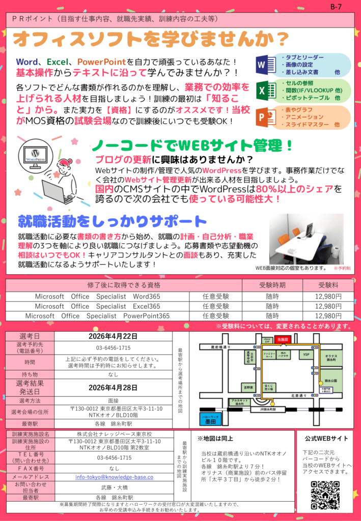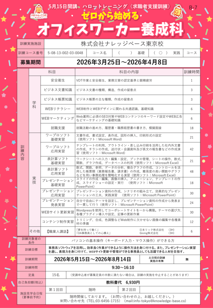 令和8年5月15日開講 ゼロから始めるオフィスワーカー養成科(募集期間:令和8年3月25日~令和8年4月8日)